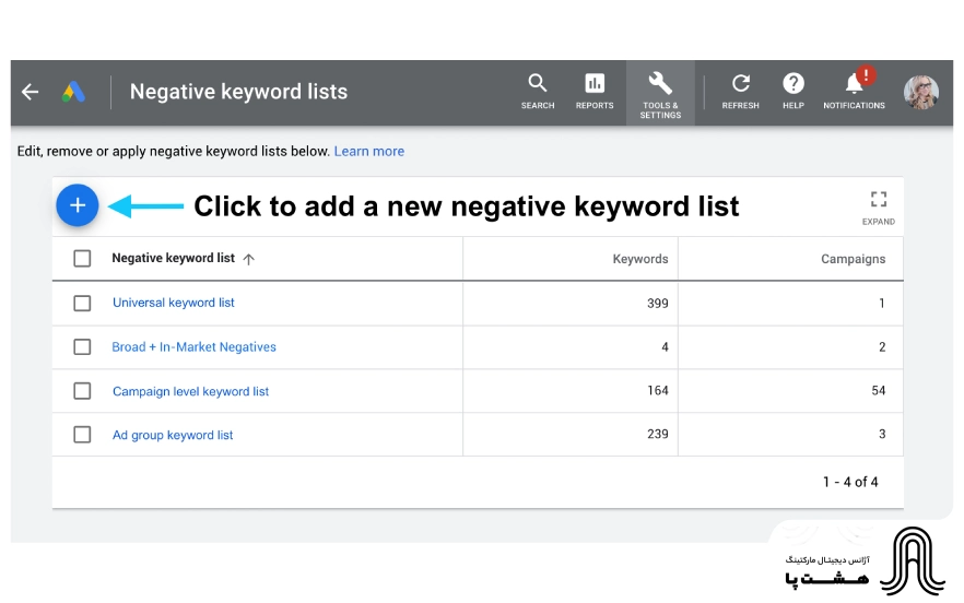 ساخت Negative Keyword List و اتصال به چند کمپین